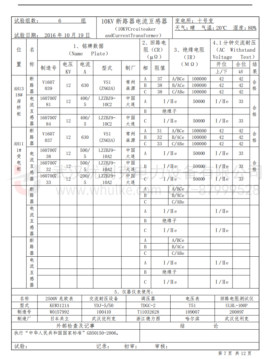 試驗電壓、加壓時間、實測泄漏電流值;